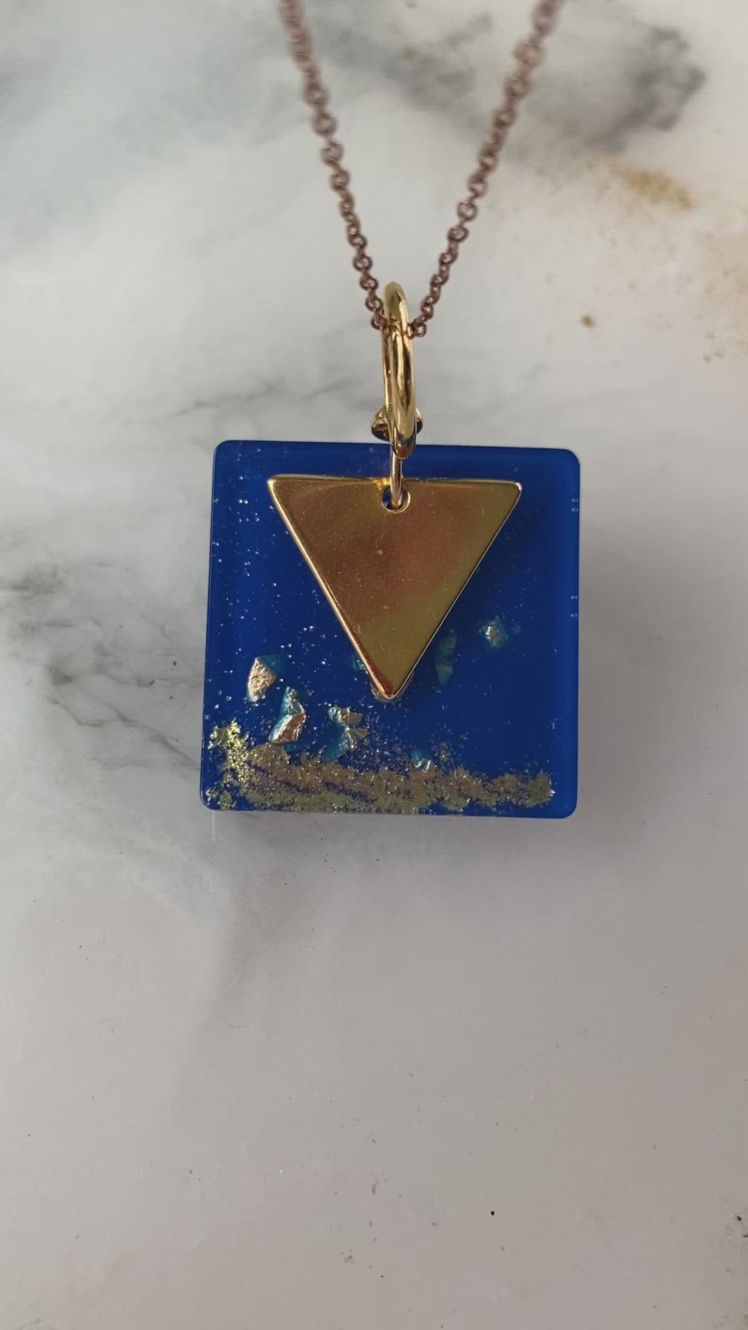 80's geïnspireerde vierkante hanger, blauw resin met 18K goudvlokken