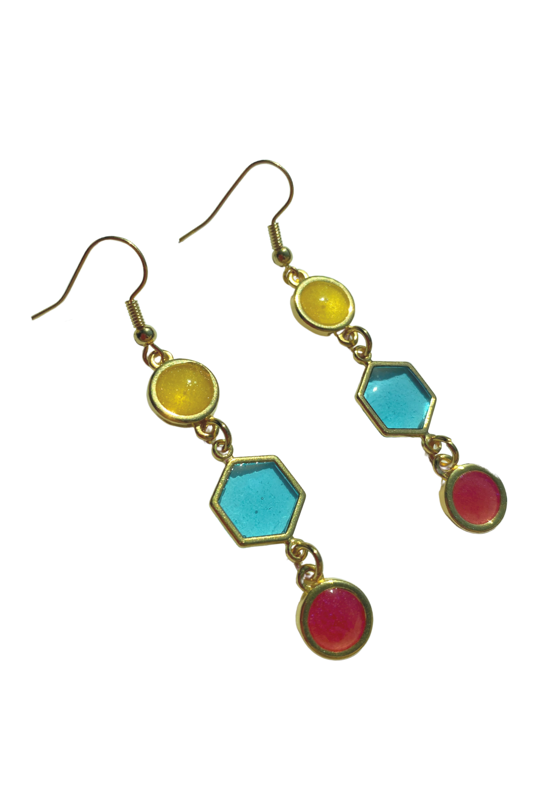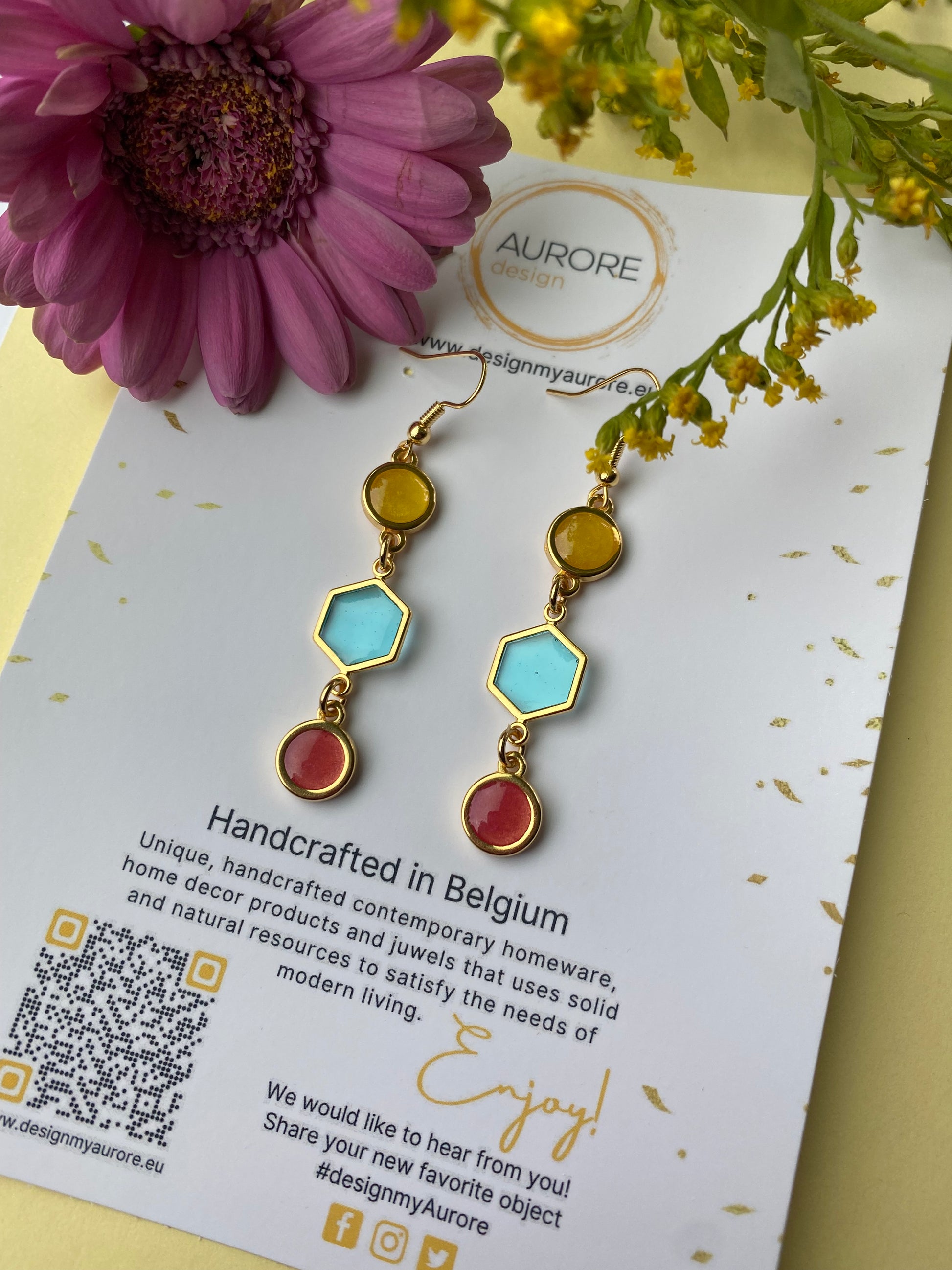 Laat je speelse kant zien met deze elegante kleurrijke oorbellen. Met dit design met goudkleurige omranding en elementen in roze, geel, oranje kleuren val je gegarandeerd op. De oorbellen zijn ontworpen voor oren met gaatjes.