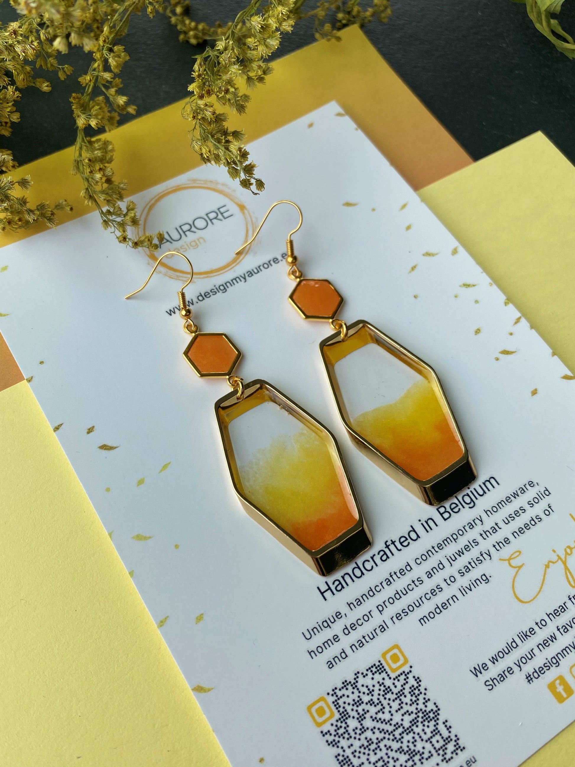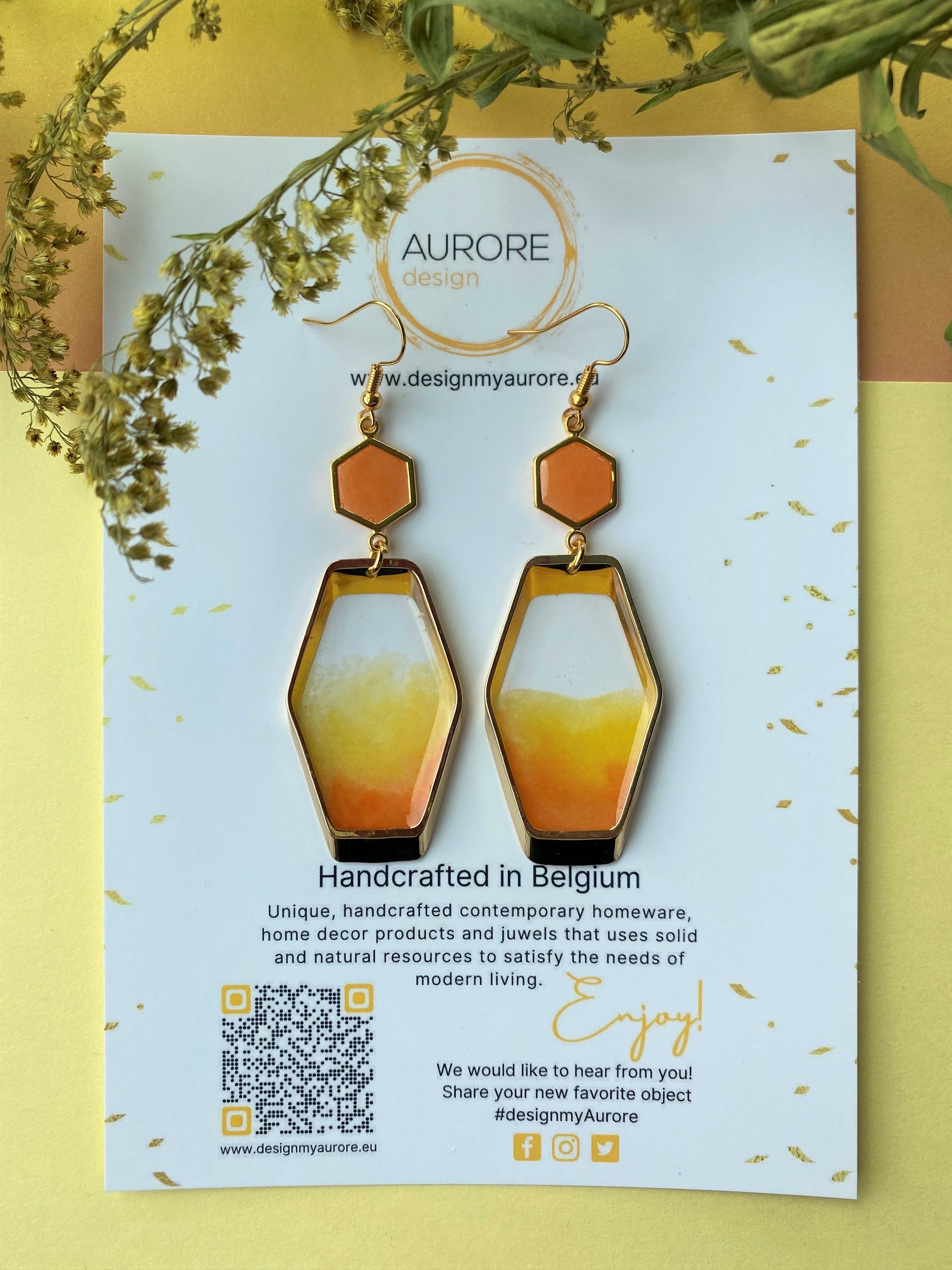Ook deze oorbellen zijn handgemaakt, kleine variaties in de tekening kunnen voorkomen. Deze oorbellen maken onderdeel uit van de Hexa lijn en komen in verschillende kleuren.