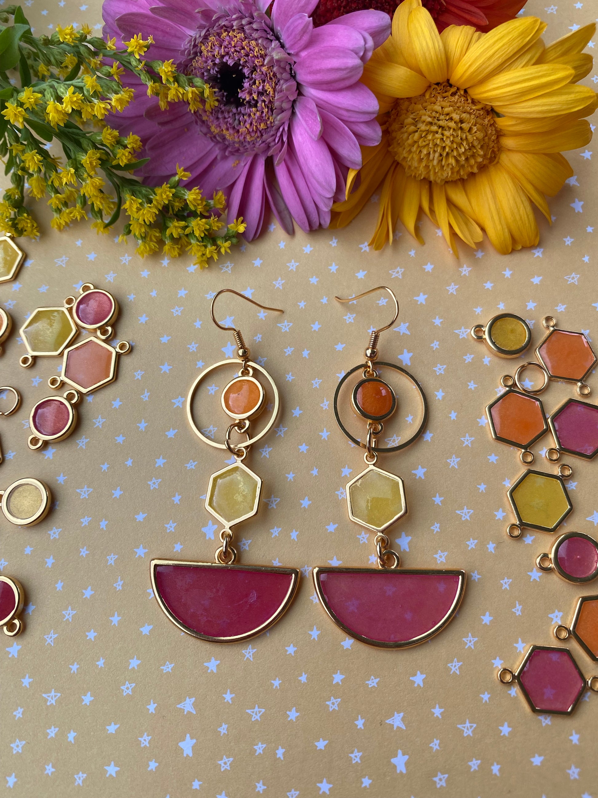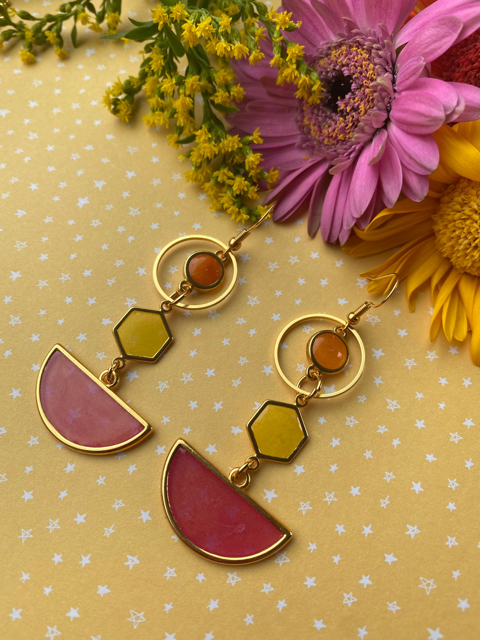 Deze unieke oorbellen kun je zowel overdag als 's avonds dragen voor een opvallende look. Deze set maakt indruk met een speelse combinatie van op druppels geïnspireerde gekleurde elementen en in elkaar grijpende kettingen met goudkleurige toplaag. Draag ze als volledige set of combineer ze met Lilia oorhangers.