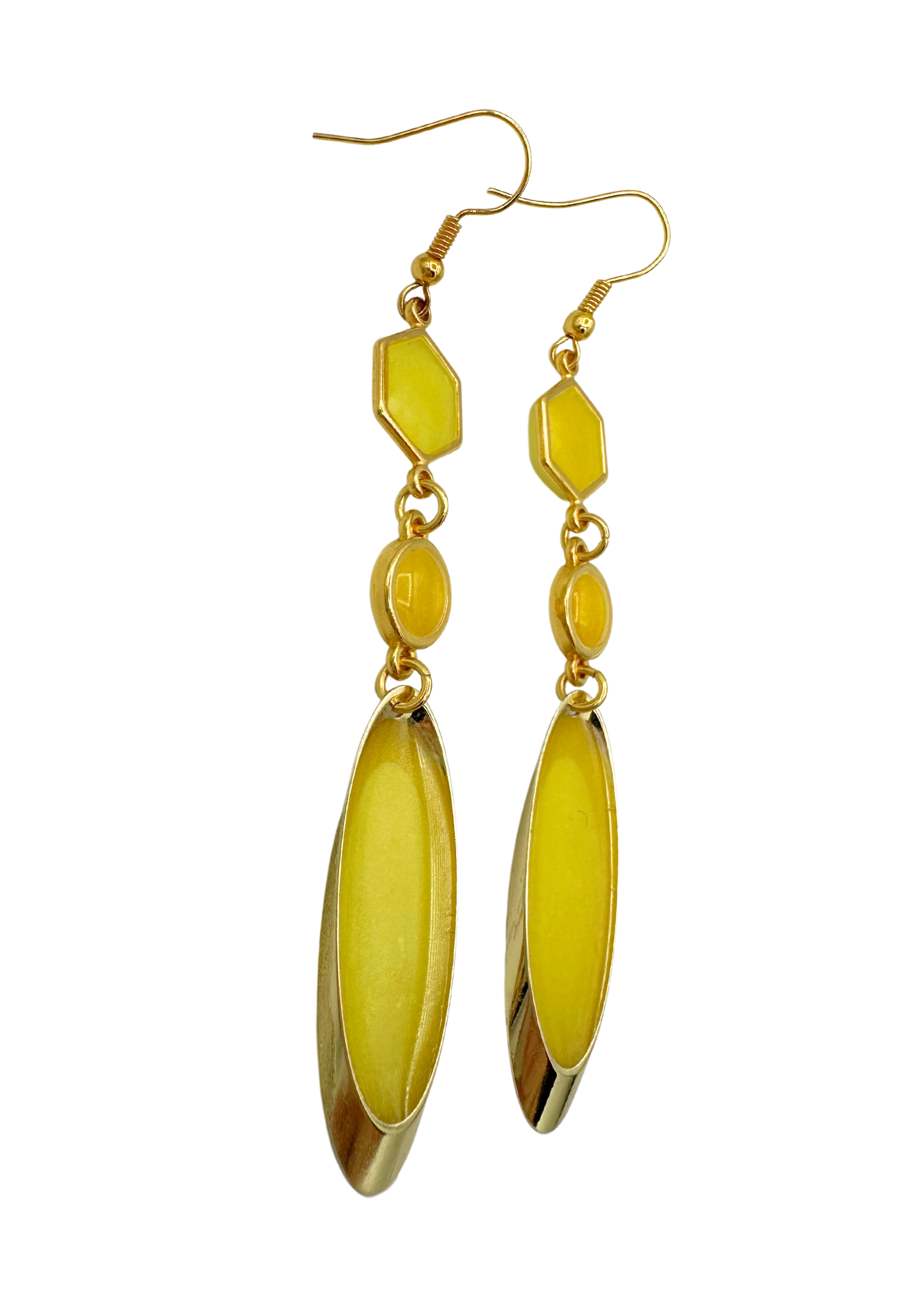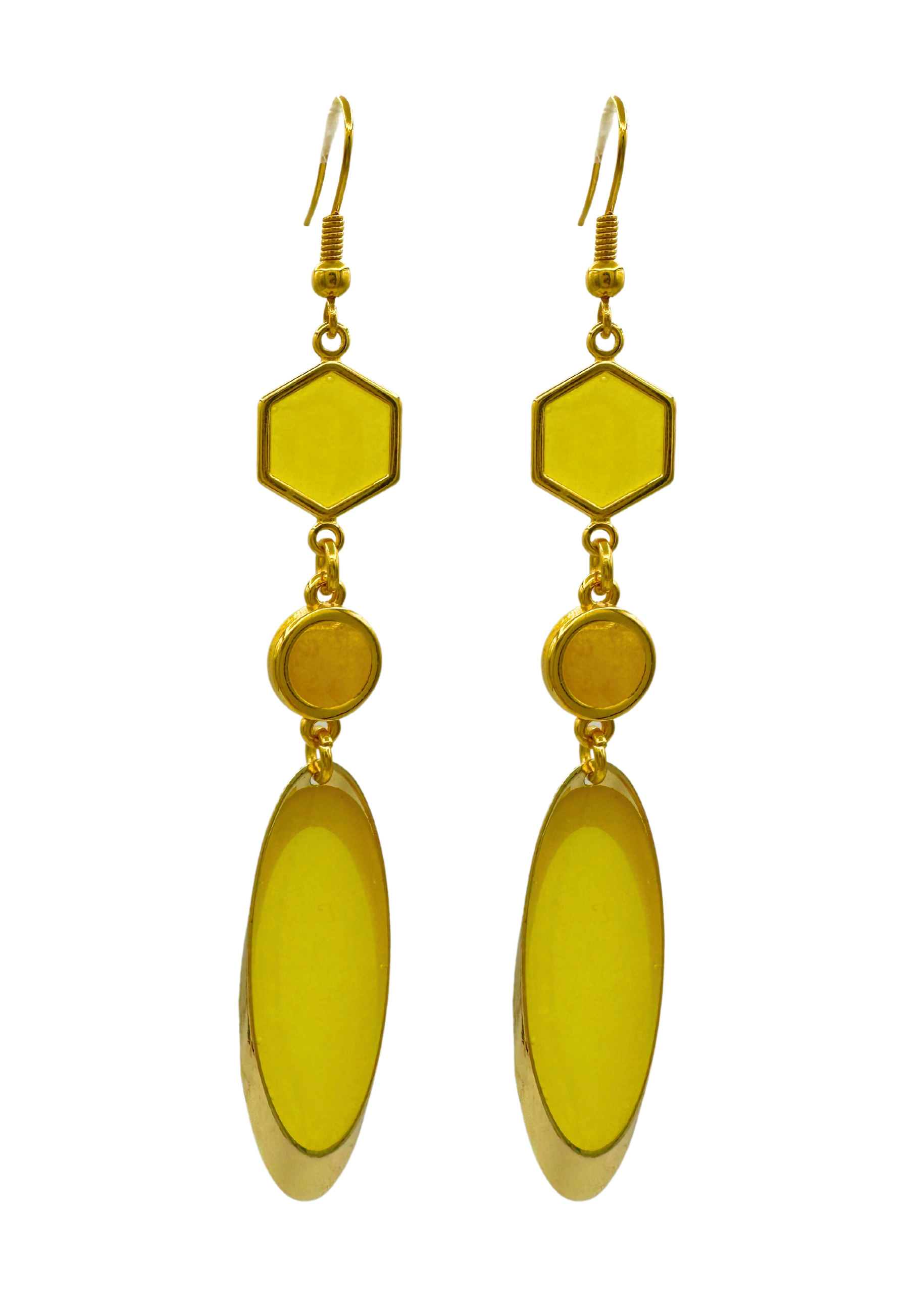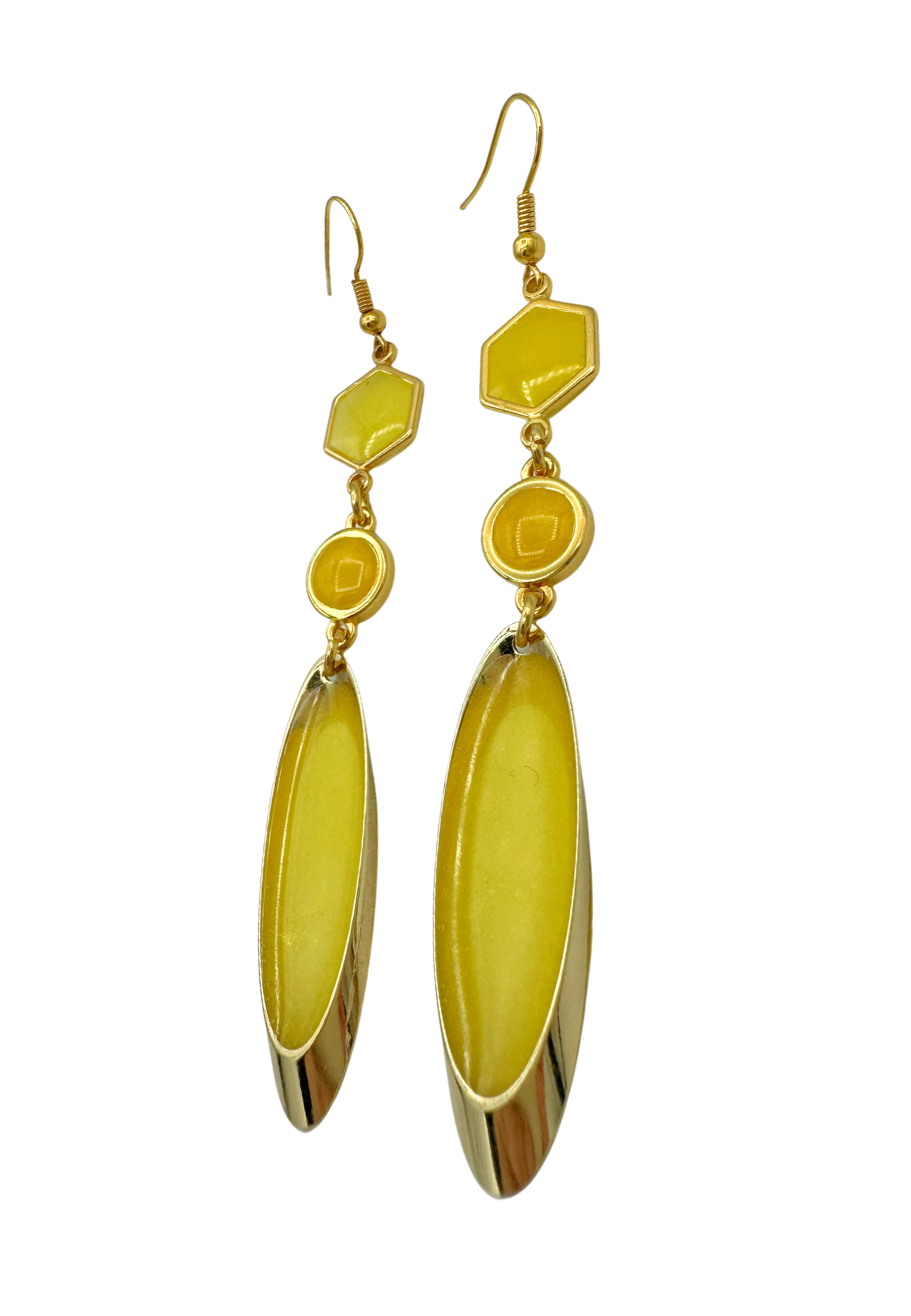 Deze extra lange, meerkleurige oorhangers bestaan uit een combinatie van een ovale, hexavormige en ronde elementen, en hangen net boven schouderlengte. Het ontwerp is een elegante look, maar speels door de zomerse kleuren. Draag ze bij een off-shouldertop om hun kleuren en vakmanschap te accentueren. Of juist bij een rolkraag om de elegantie te benadrukken.