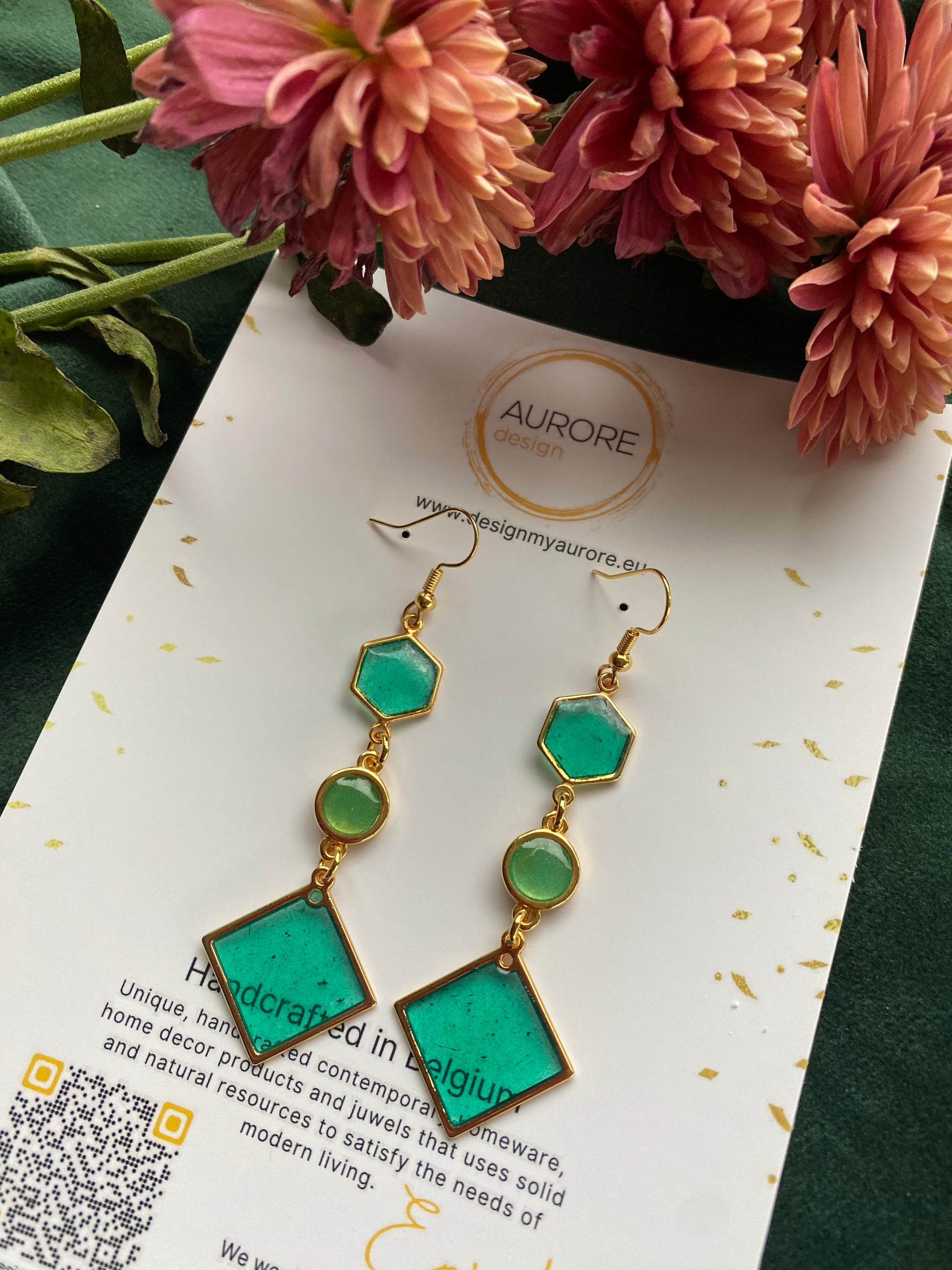 Deze veelzijdige oorbellen zijn tijdloos en vrouwelijk en maken je outfits direct speciaal. Het unieke paar is voorzien van groene geometrische vormen en heeft een gouden rand. De oorbellen zijn ontworpen voor oren met gaatjes.