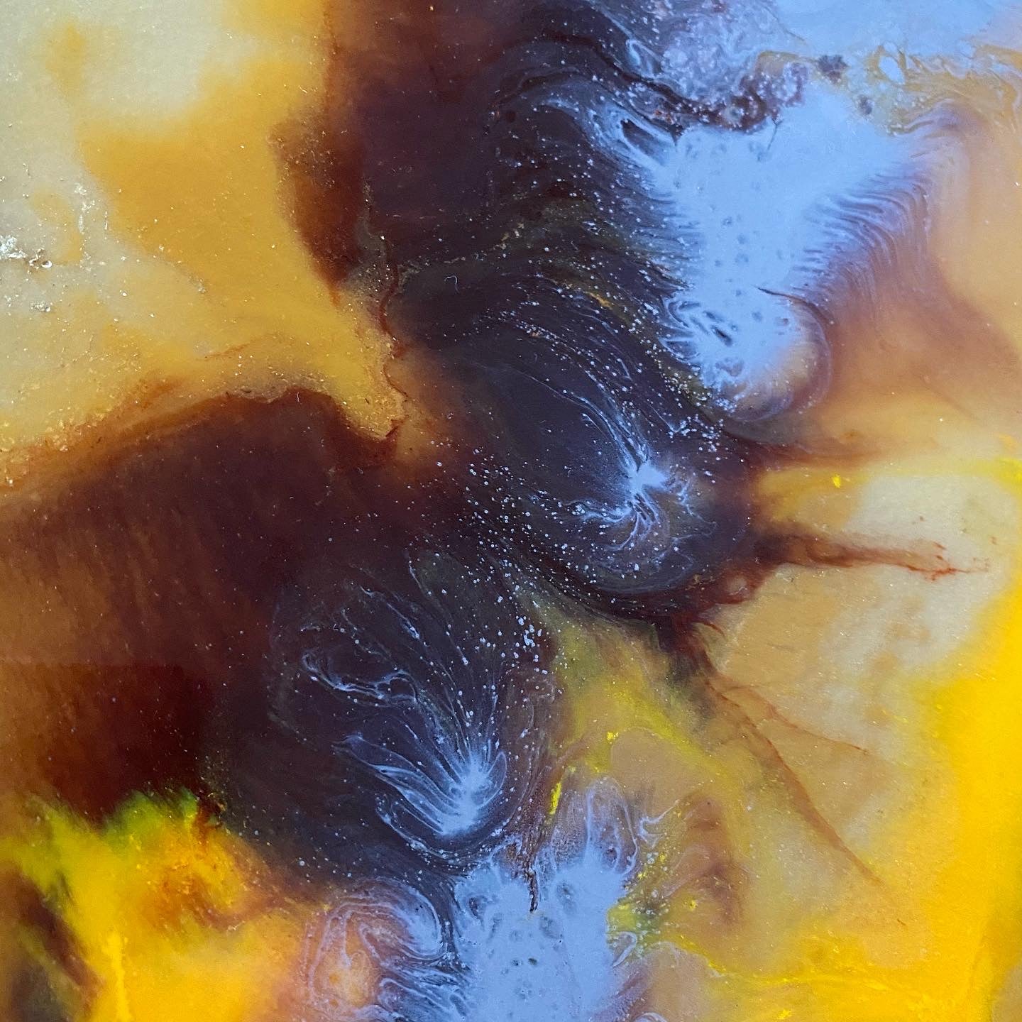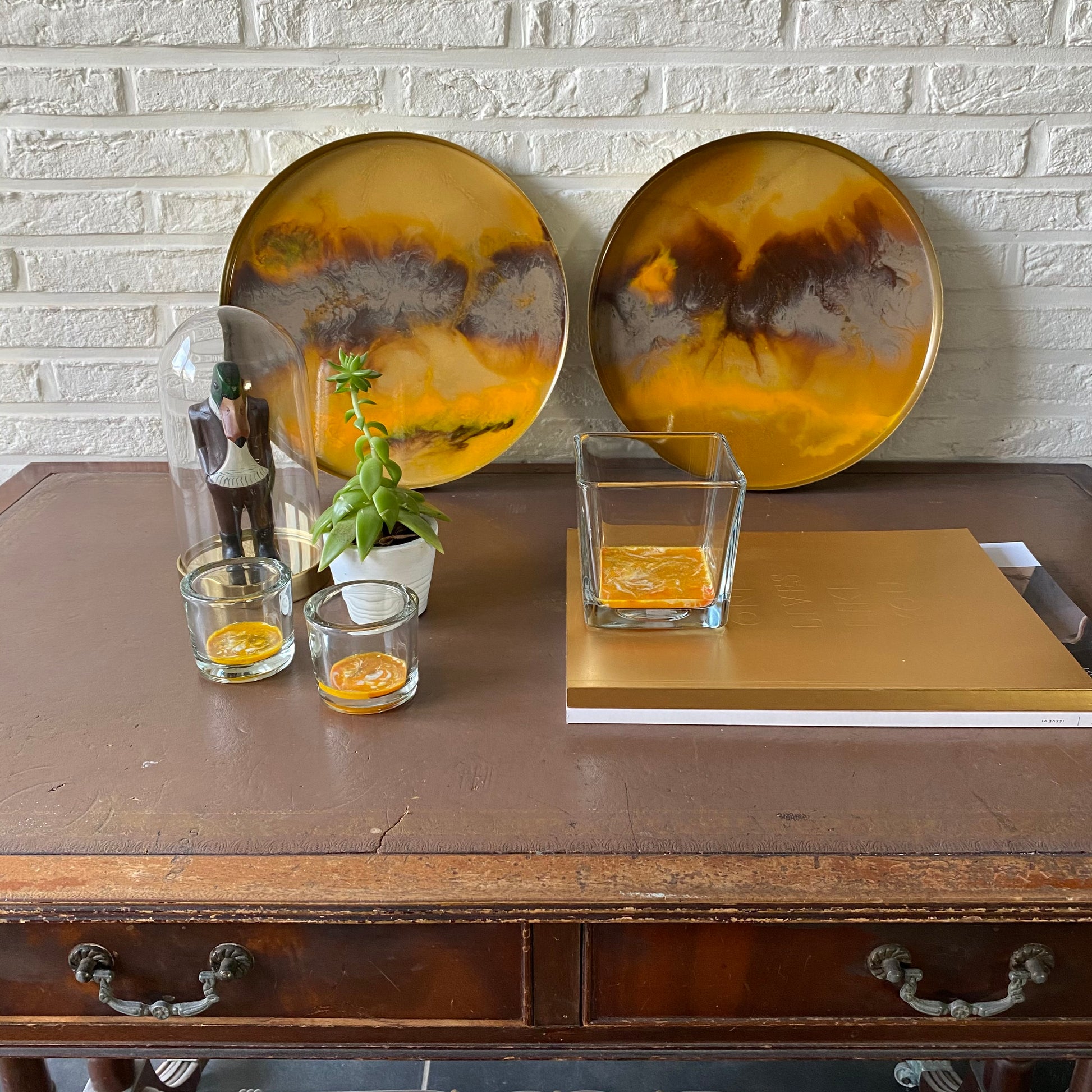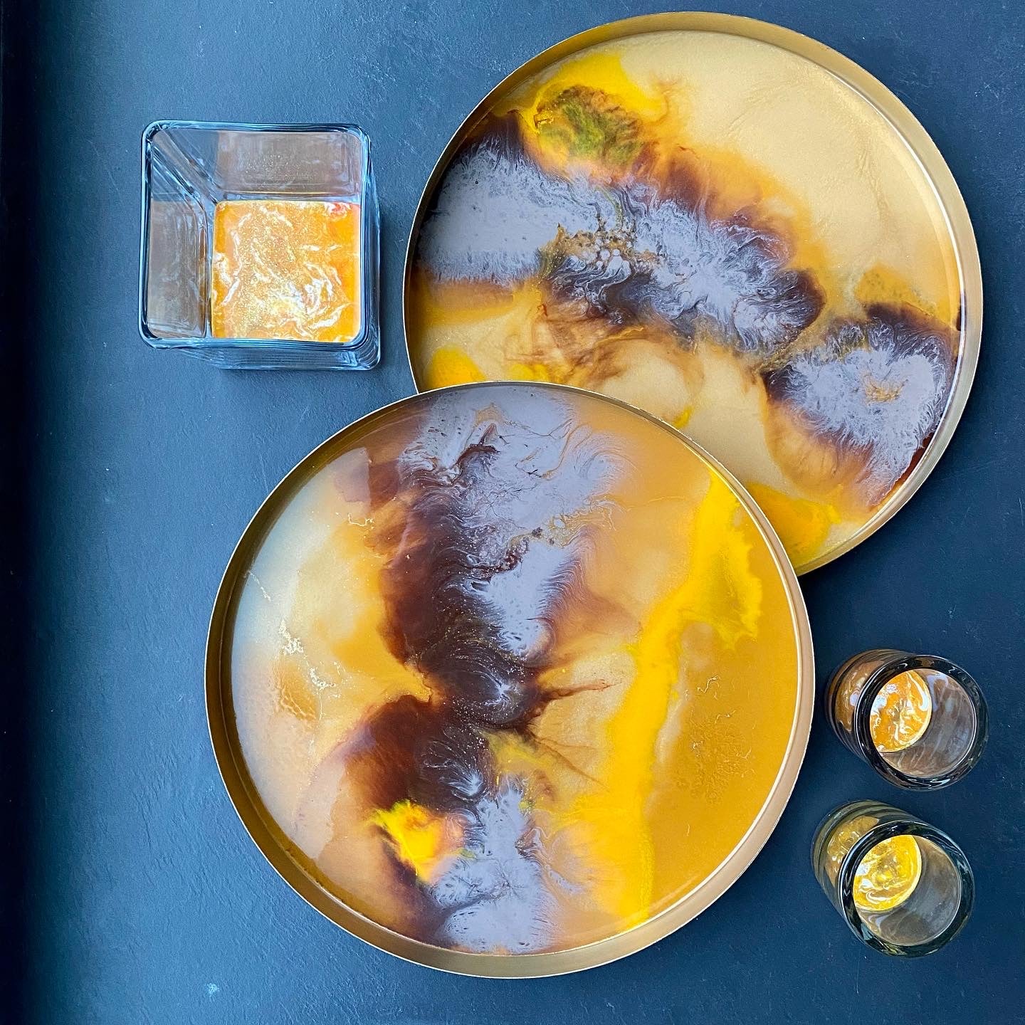 Deze prachtige gouden kleur metalen dienblad met hars inleg, past in bijna alle interieurs. Geweldig om te gebruiken op feestjes om mensen te verrassen met een uniek dienblad. Of om te gebruiken op een zondagmiddag voor een koffie of theepauze in de tuin.