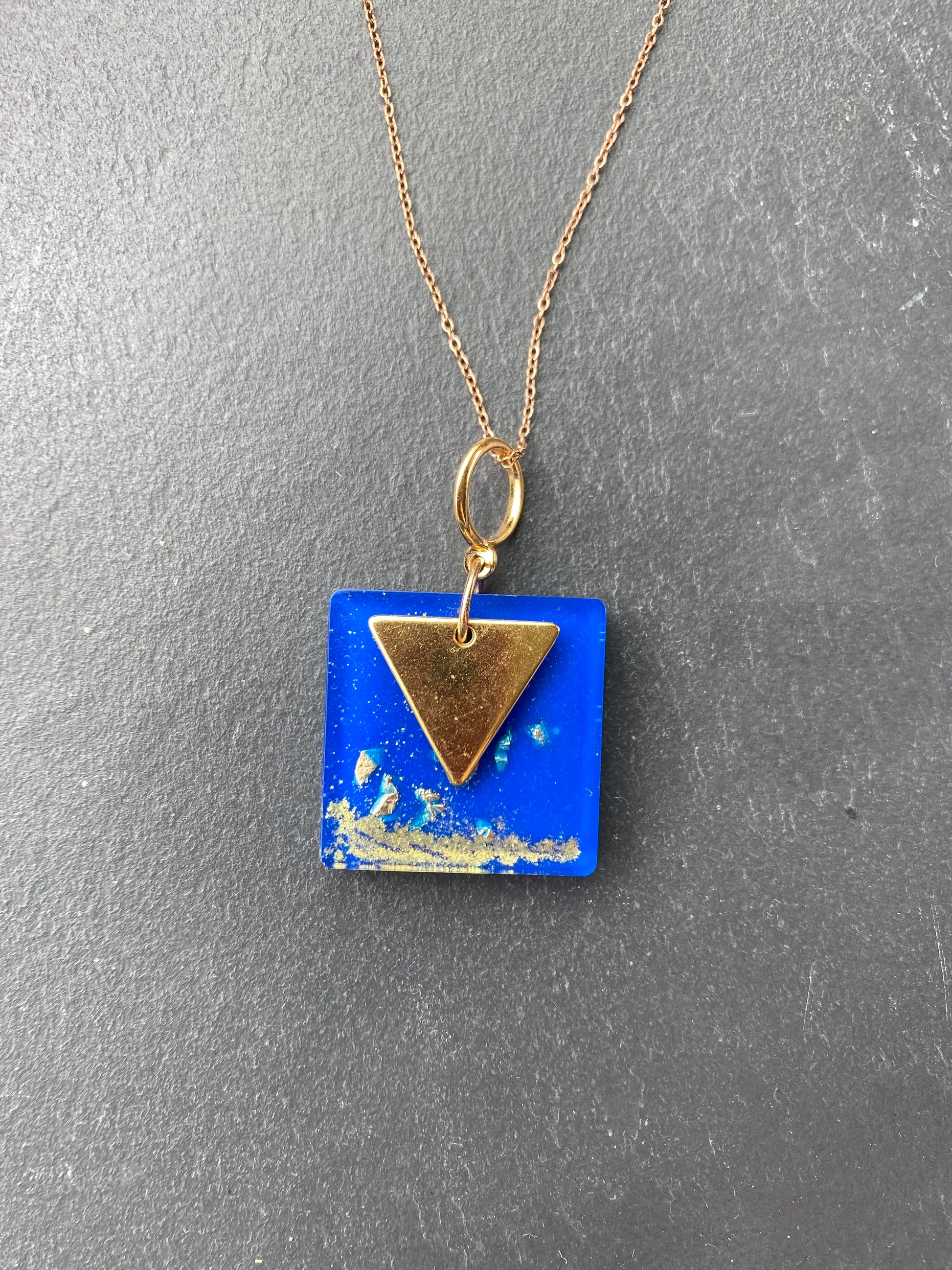 80's geïnspireerde vierkante hanger, blauw resin met 18K goudvlokken
