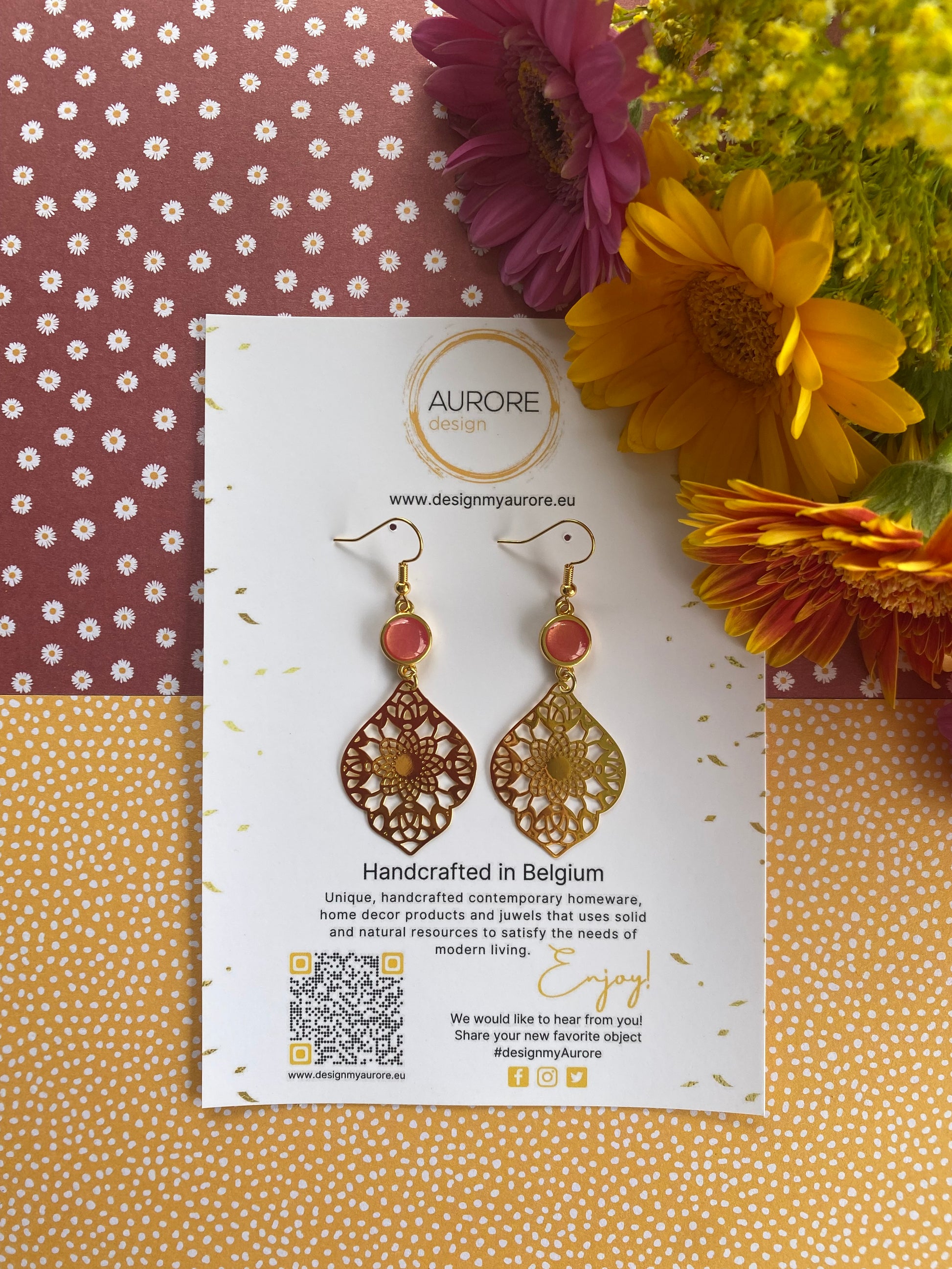 Deze stijlvolle gouden bohemian oorbellen hebben filigraan patroon met een kleine roze schakel voor dat beetje kleur dat vlot combineert met veel outfits.