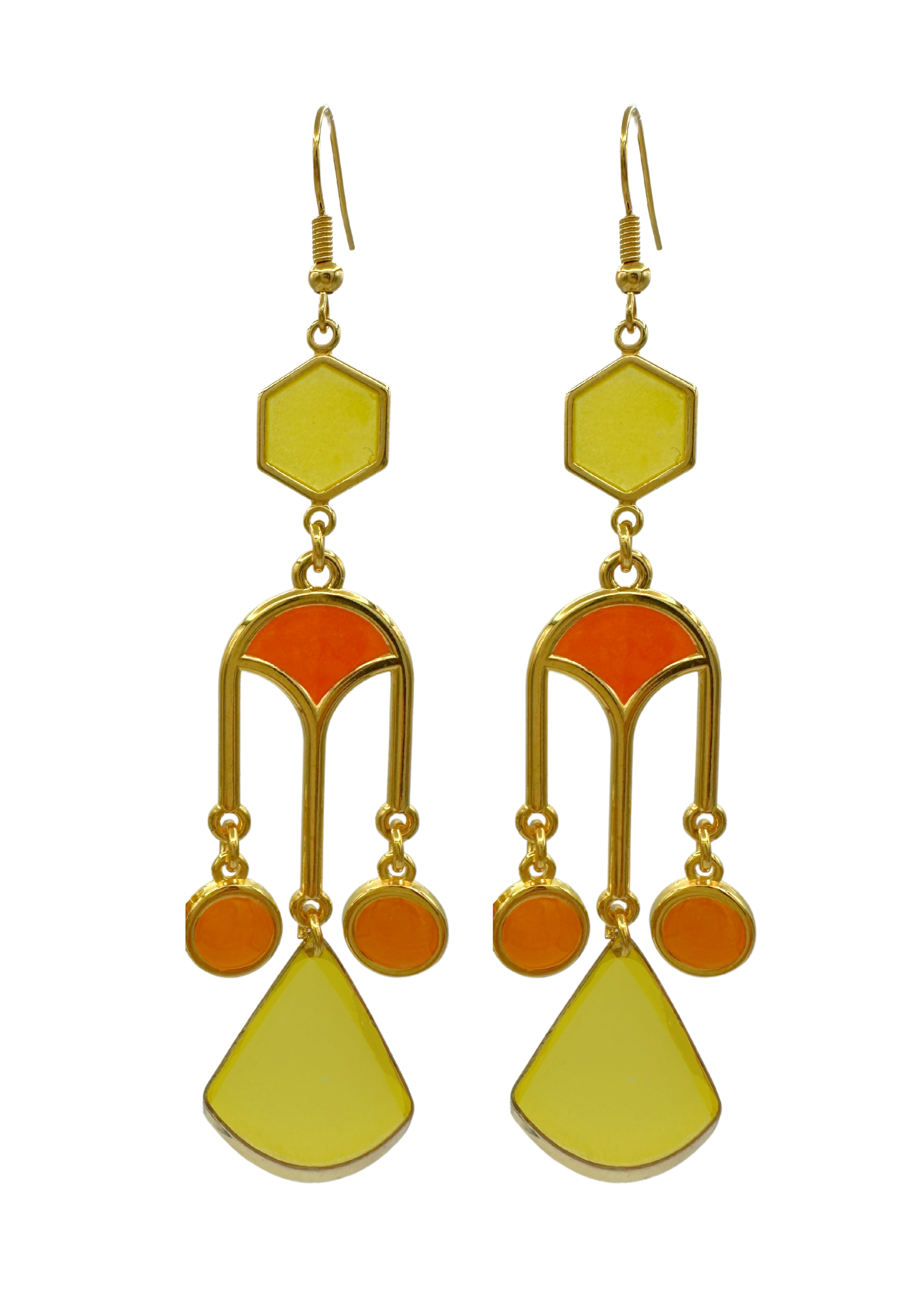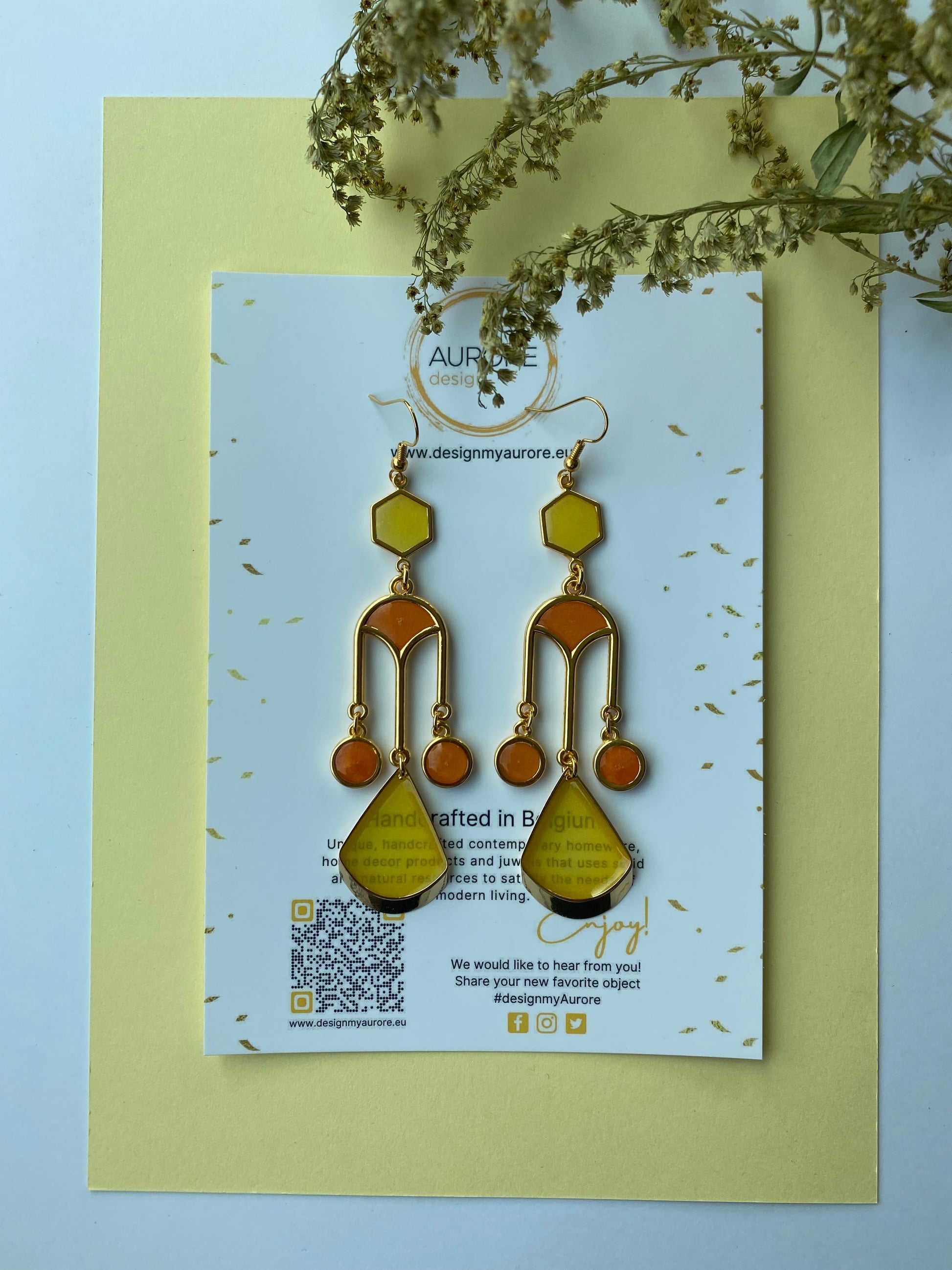Deze grote boho geïnspireerde kroonluchter oorstekers zijn vakkundig vervaardigd van verschillende vormen in rijke tinten. De oorsieraden zijn afgewerkt met een haakdetail met een goud kleurtoon en een enkel ruit aan het uiteinde. Draag met een strak pak en eenvoudige kledingstukken om de minimalistische silhouetten tot hun recht te laten komen. Deze oorsieraden maken onderdeel uit van de Bow-lijn en komen in meerdere kleuren.