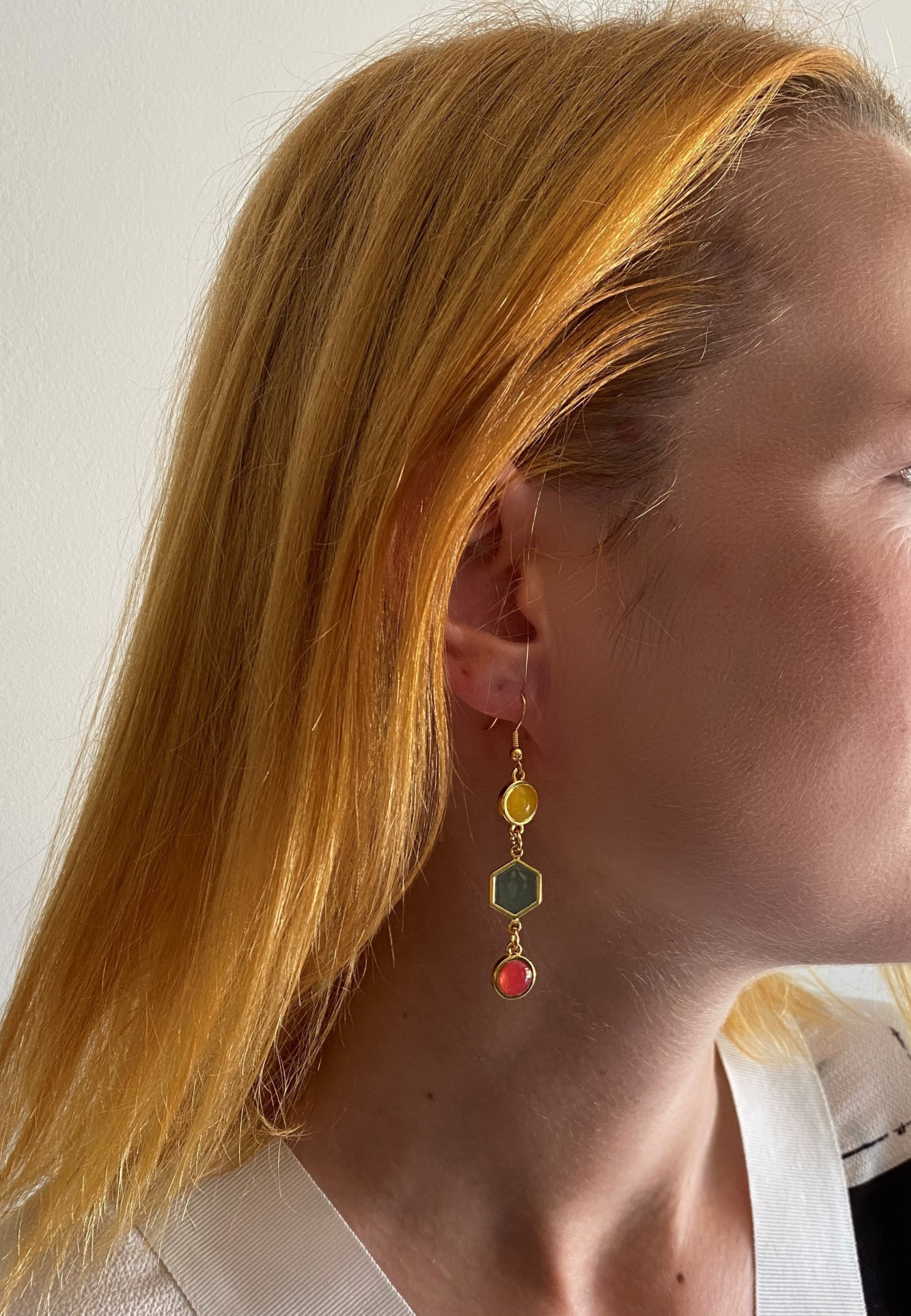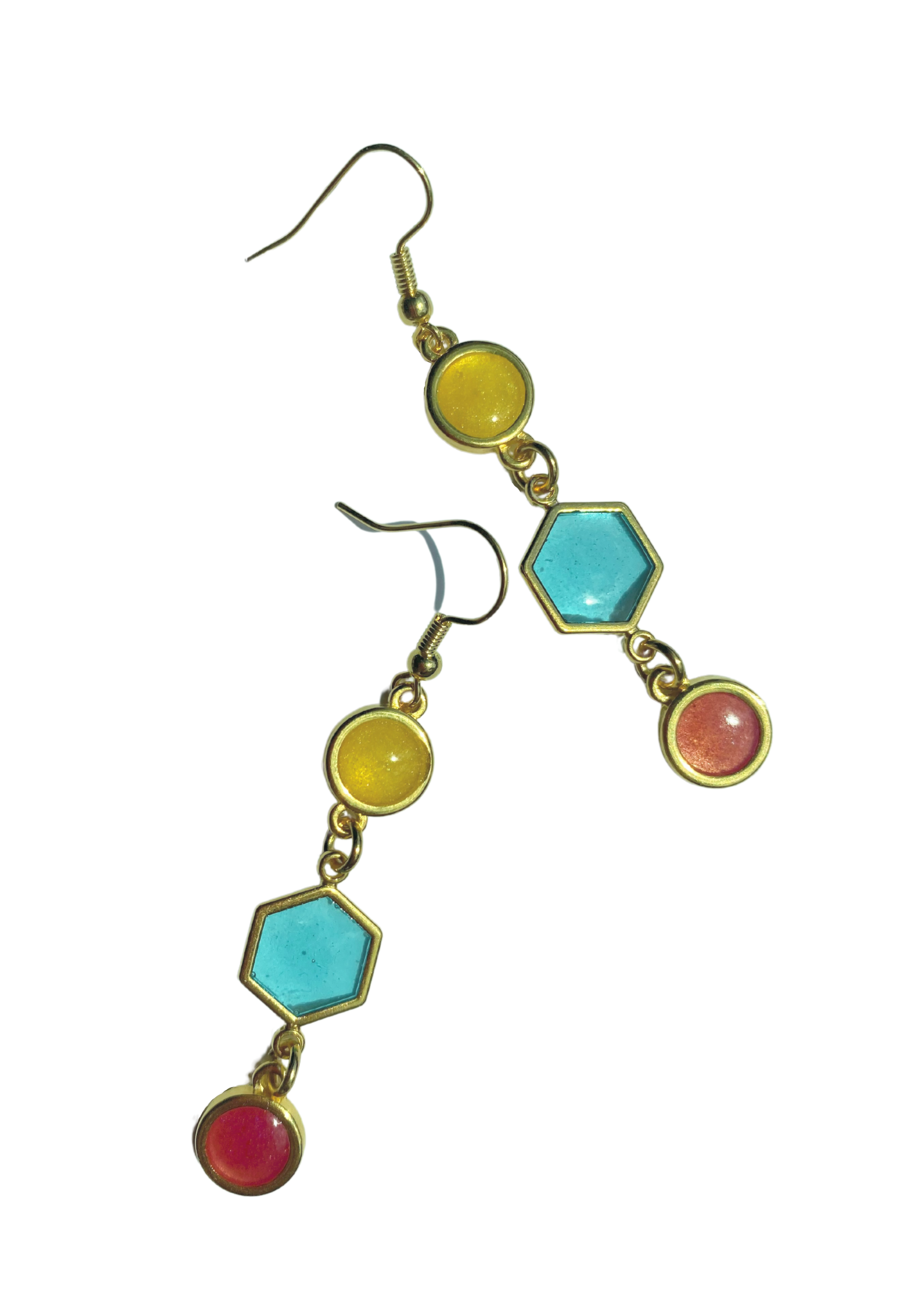 Laat je speelse kant zien met deze elegante kleurrijke oorbellen. Met dit design met goudkleurige omranding en elementen in roze, geel, oranje kleuren val je gegarandeerd op. De oorbellen zijn ontworpen voor oren met gaatjes.