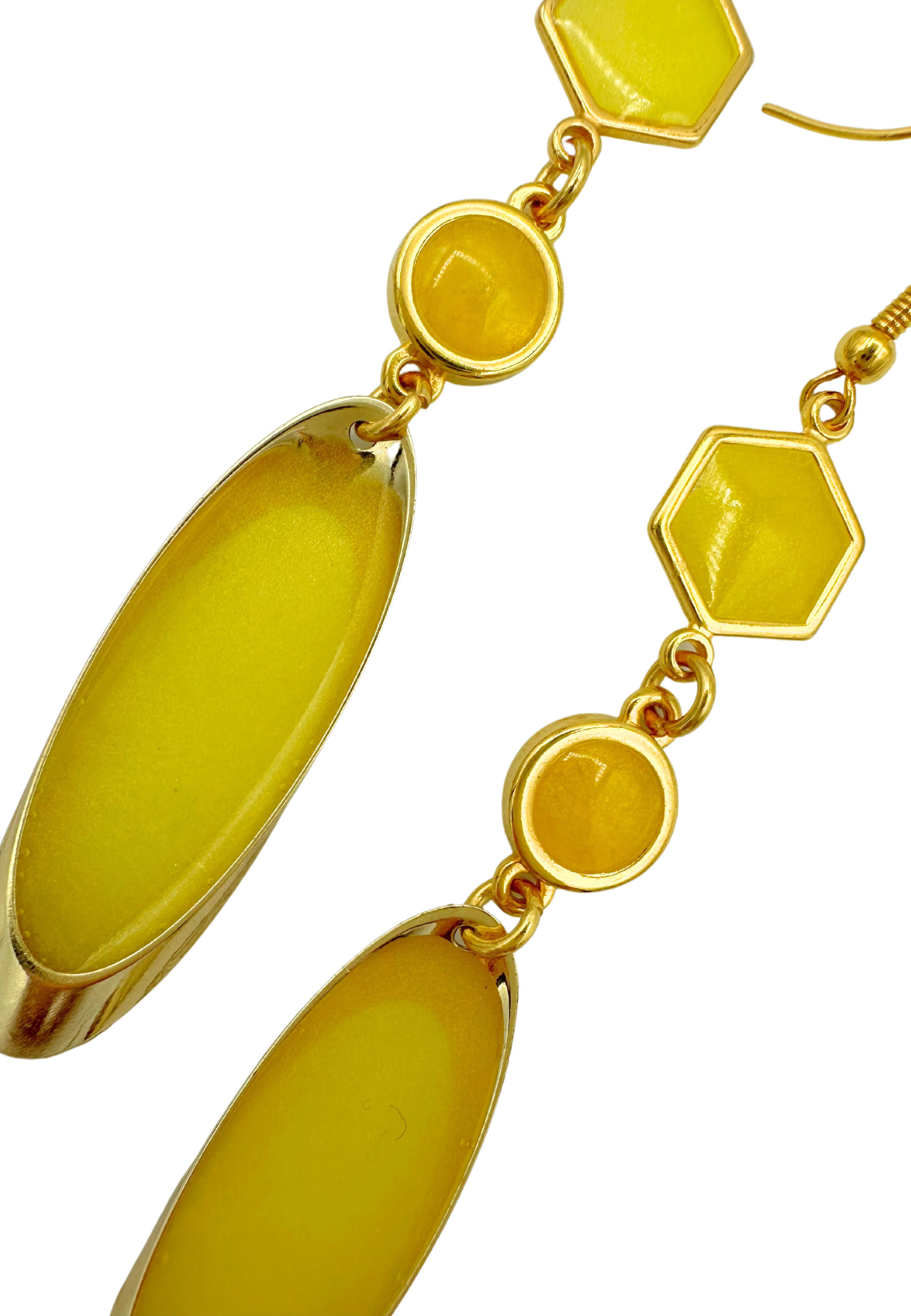 Deze extra lange, meerkleurige oorhangers bestaan uit een combinatie van een ovale, hexavormige en ronde elementen, en hangen net boven schouderlengte. Het ontwerp is een elegante look, maar speels door de zomerse kleuren. Draag ze bij een off-shouldertop om hun kleuren en vakmanschap te accentueren. Of juist bij een rolkraag om de elegantie te benadrukken.