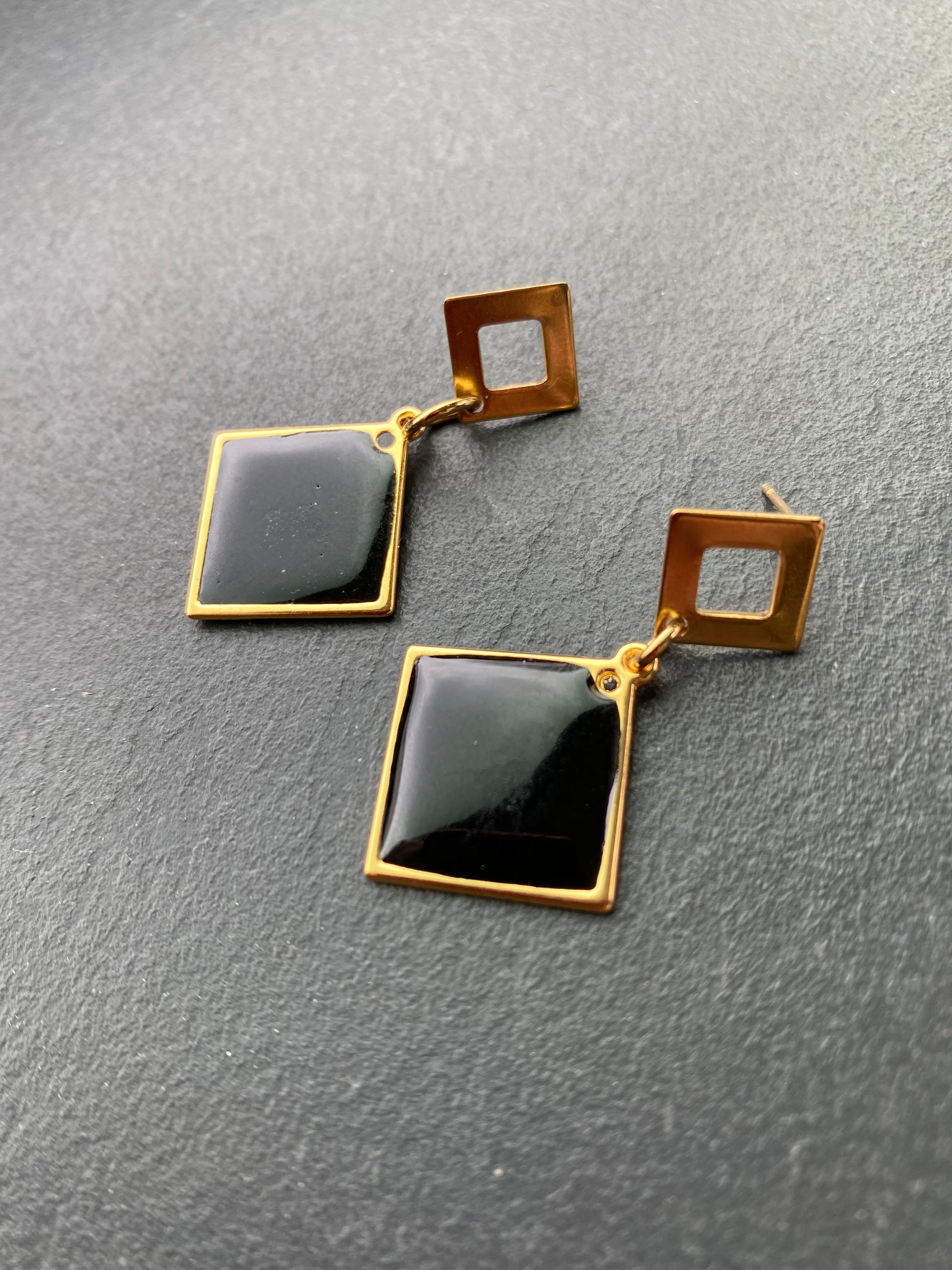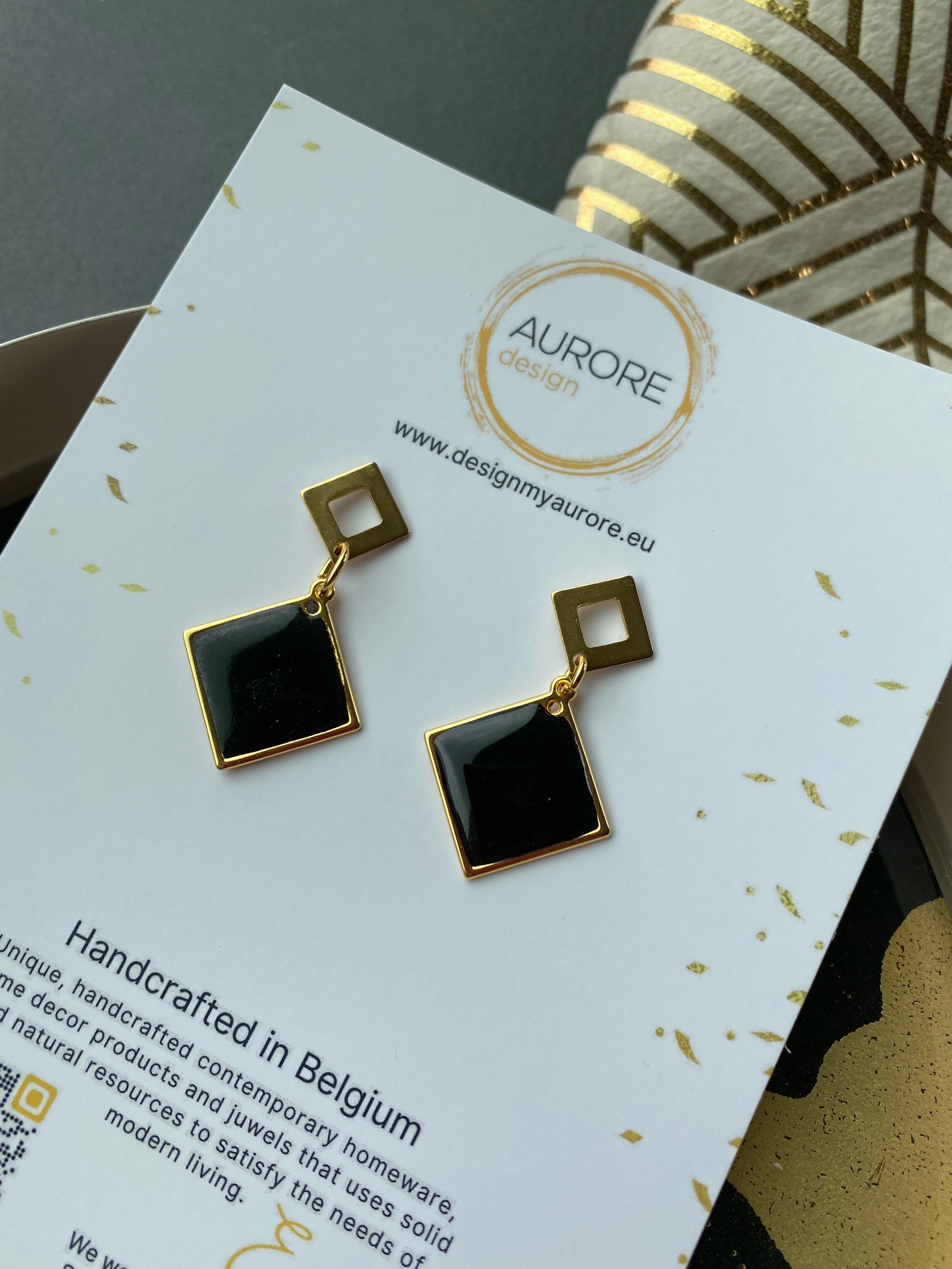 Met deze prachtige gouden oorbellen met zwarte resin inleg geef jij jouw outfit een stijlvolle en opvallende look. Een statement piece die jouw collectie nog mist!