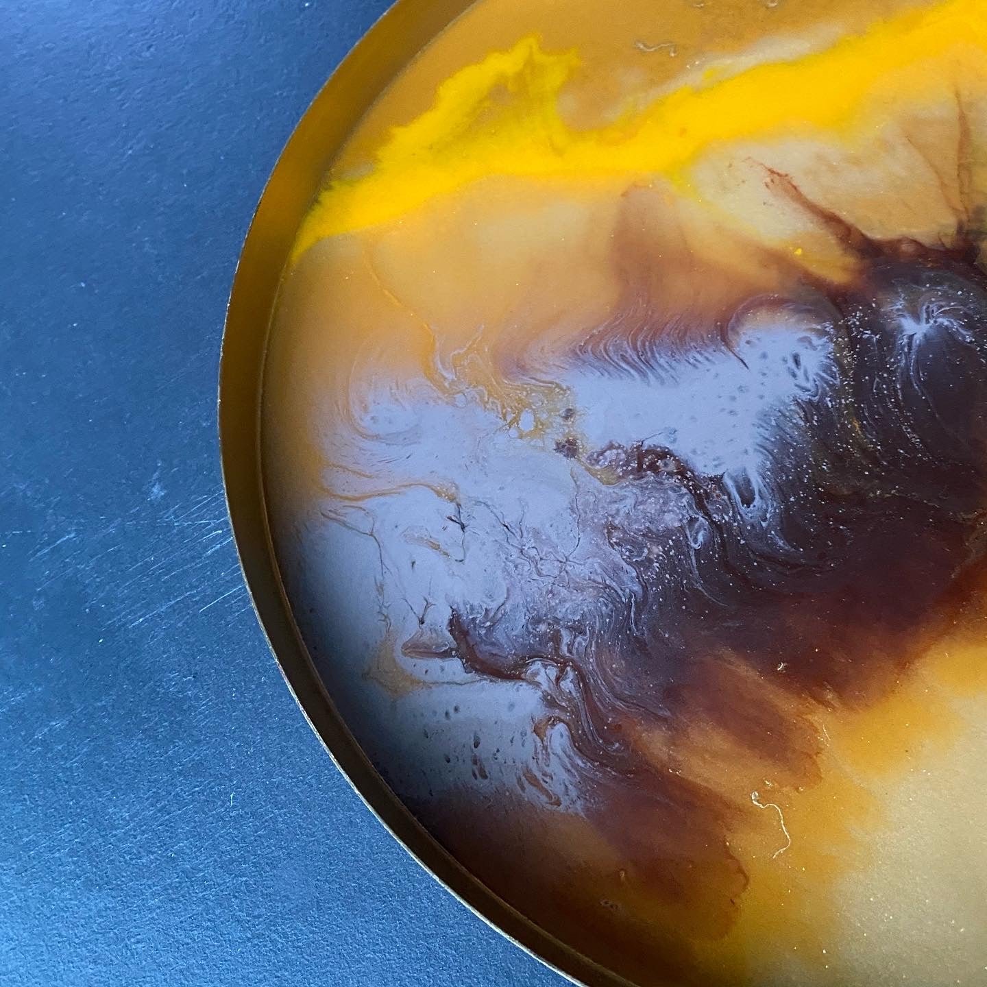 Deze prachtige gouden kleur metalen dienblad met hars inleg, past in bijna alle interieurs. Geweldig om te gebruiken op feestjes om mensen te verrassen met een uniek dienblad. Of om te gebruiken op een zondagmiddag voor een koffie of theepauze in de tuin.